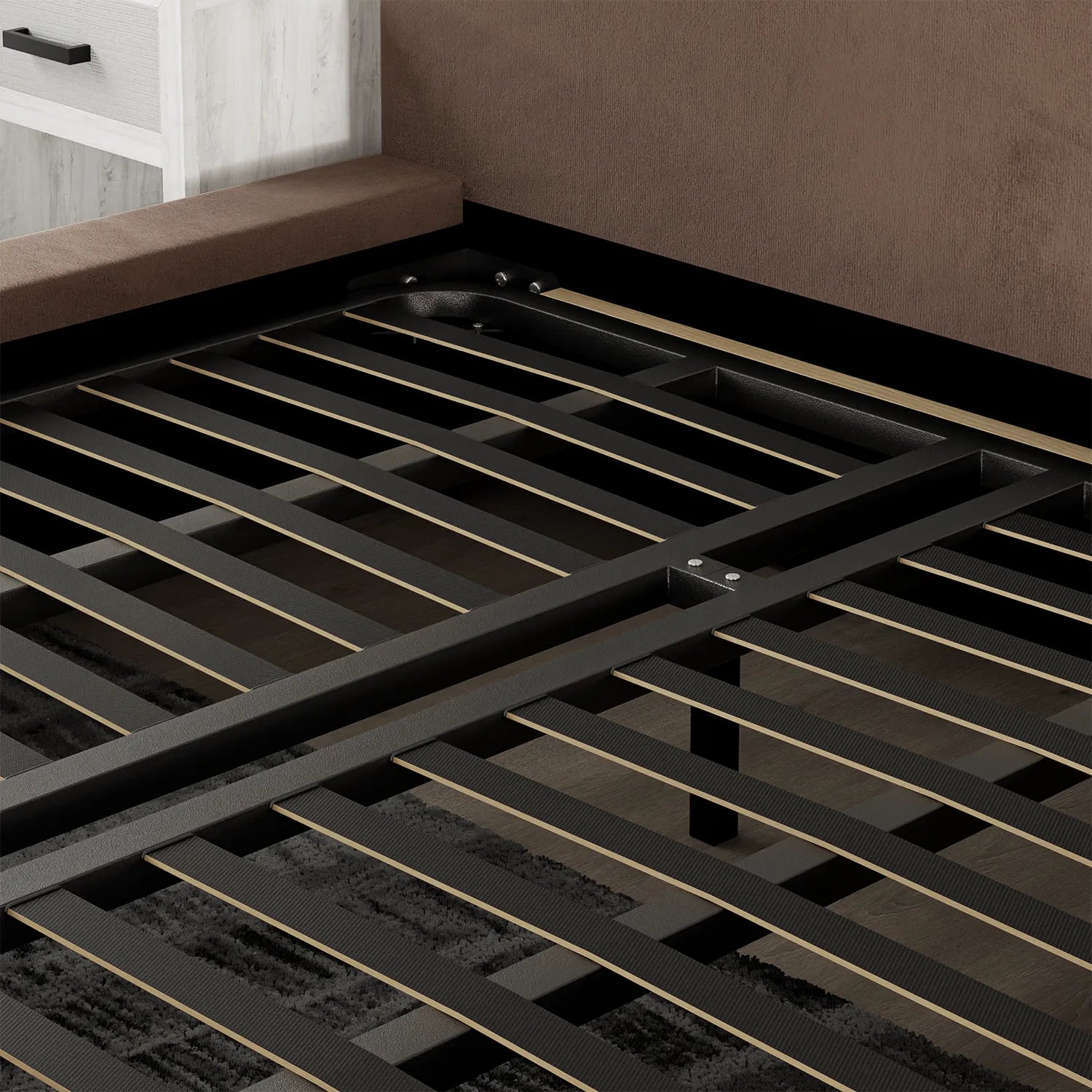 Le soutien du matelas pour la base de lit AUREA queen taupe est assuré par des lattes intégrées dans une structure robuste en acier galvanisé.