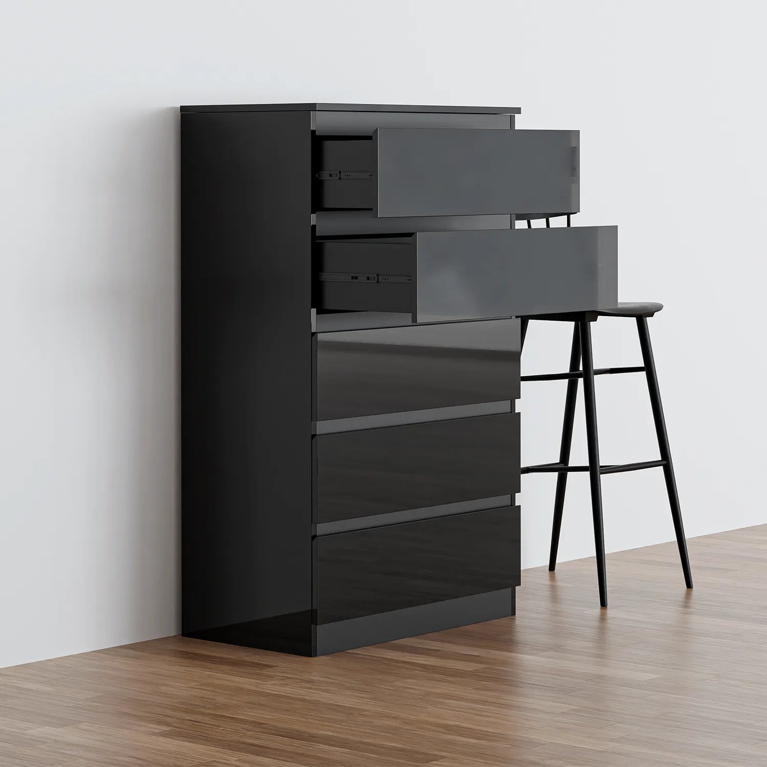 Add a modern and functional touch to your bedroom with the COMOD 5-drawer dresser. Its five spacious drawers and glossy black finish provide elegant organization and a sleek design that seamlessly blends into any contemporary decor. Style and practicality in perfect harmony.