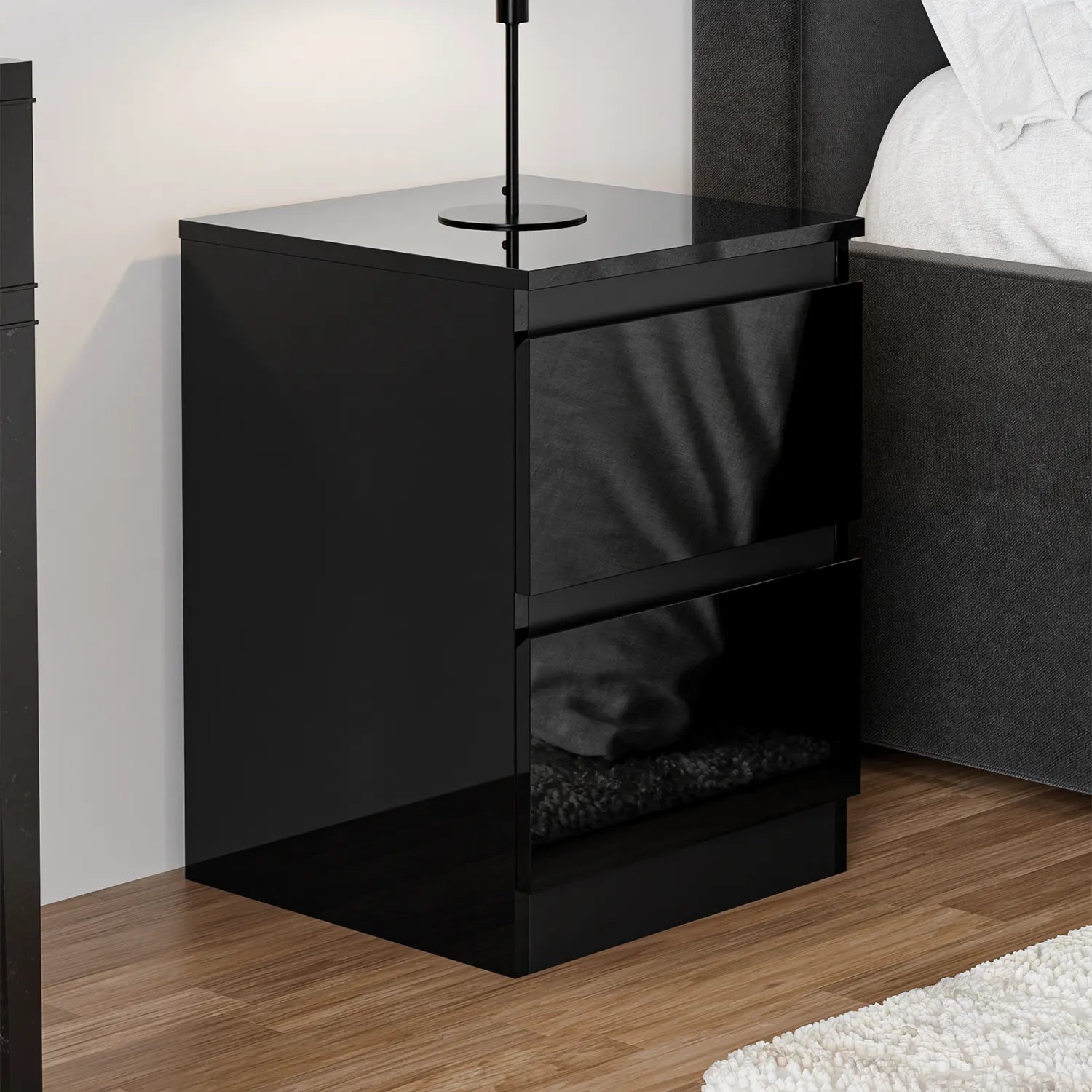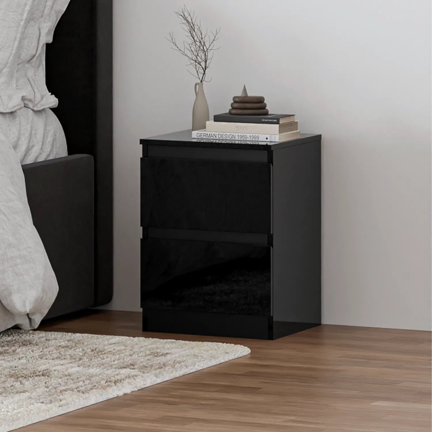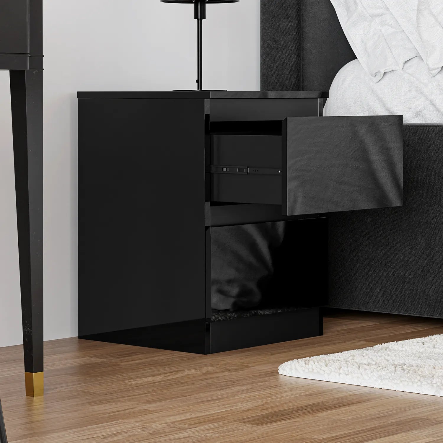 Maximize your space with the COMOD nightstand. Its compact design and glossy black finish add a modern touch to your bedroom. Featuring two spacious drawers, it’s perfect for keeping your essentials within reach while maintaining an elegant and functional look.