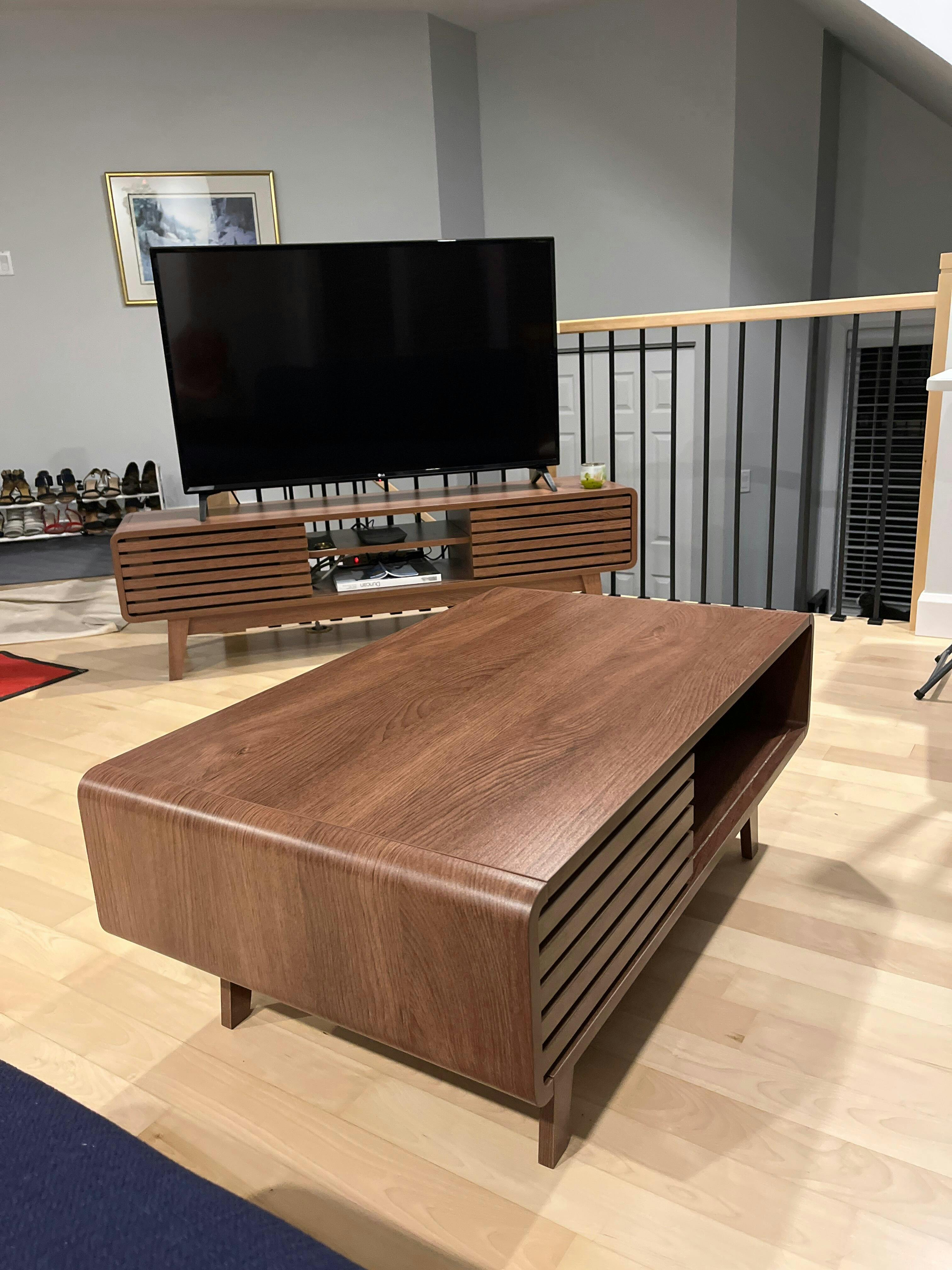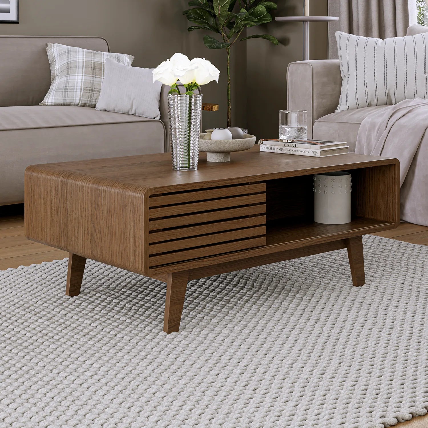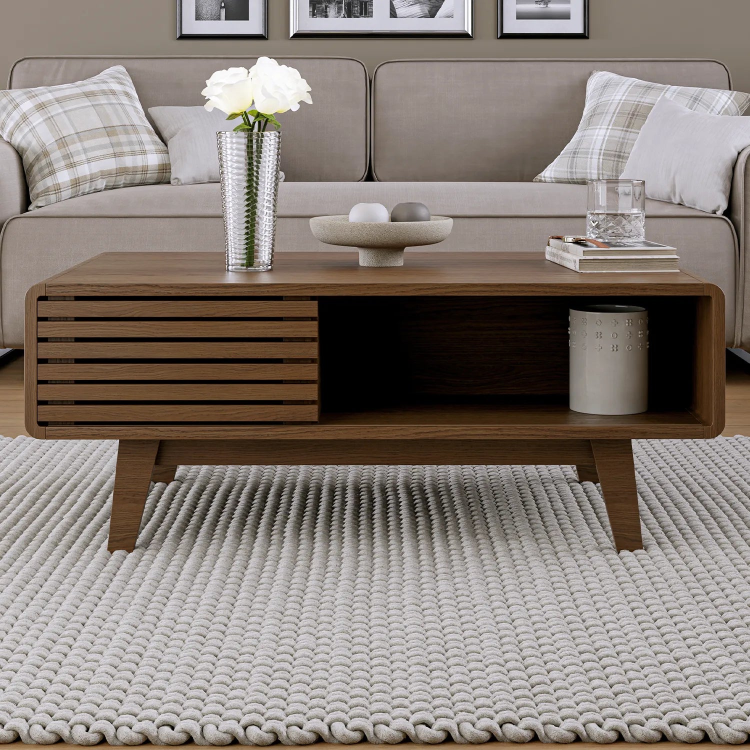 Complete your living room set with the KOVA coffee table. With its golden walnut finish and slatted design, this coffee table harmoniously combines functionality and elegance. Ideal for creating a cohesive and welcoming living space, it adapts equally well to modern decors as to more classic ambiances.