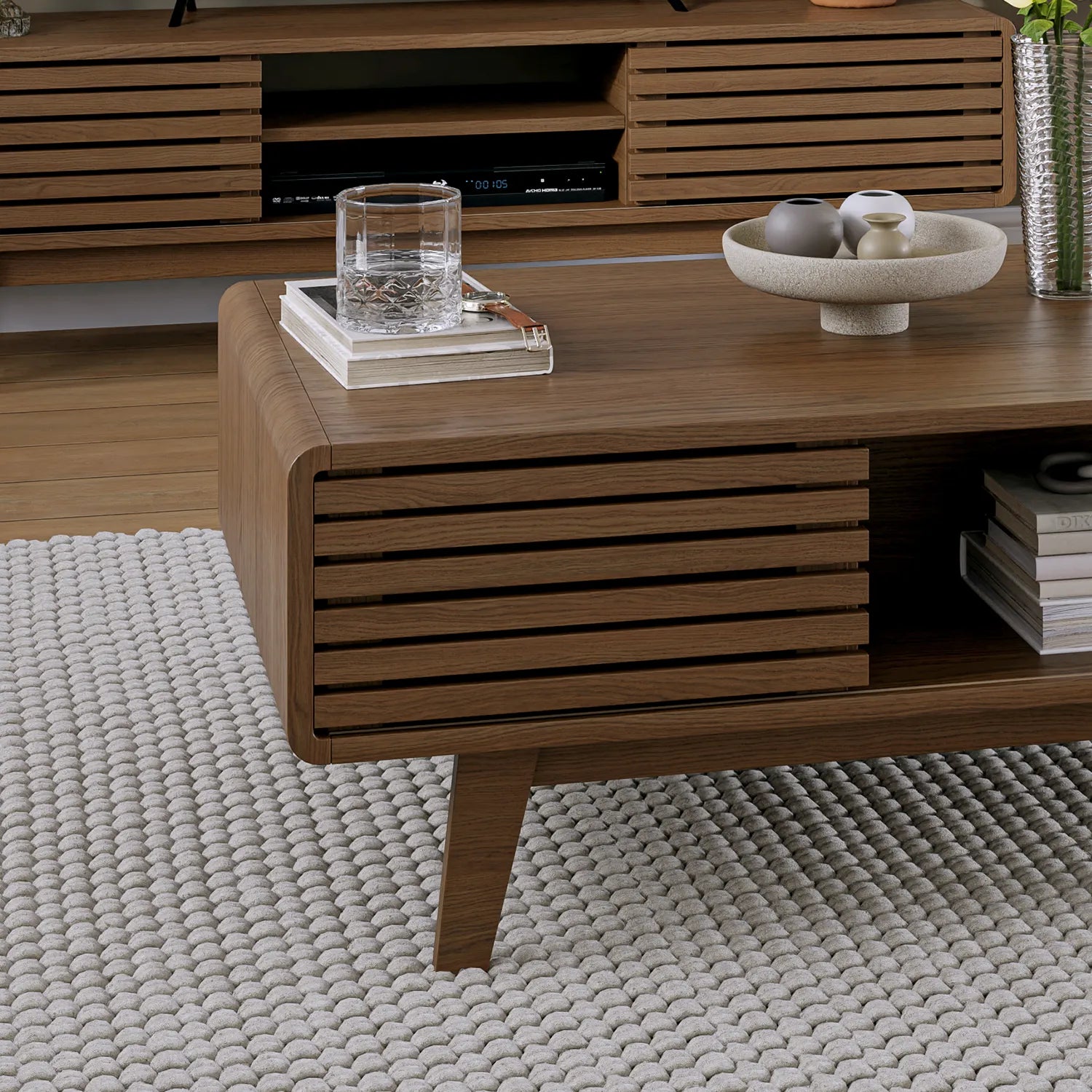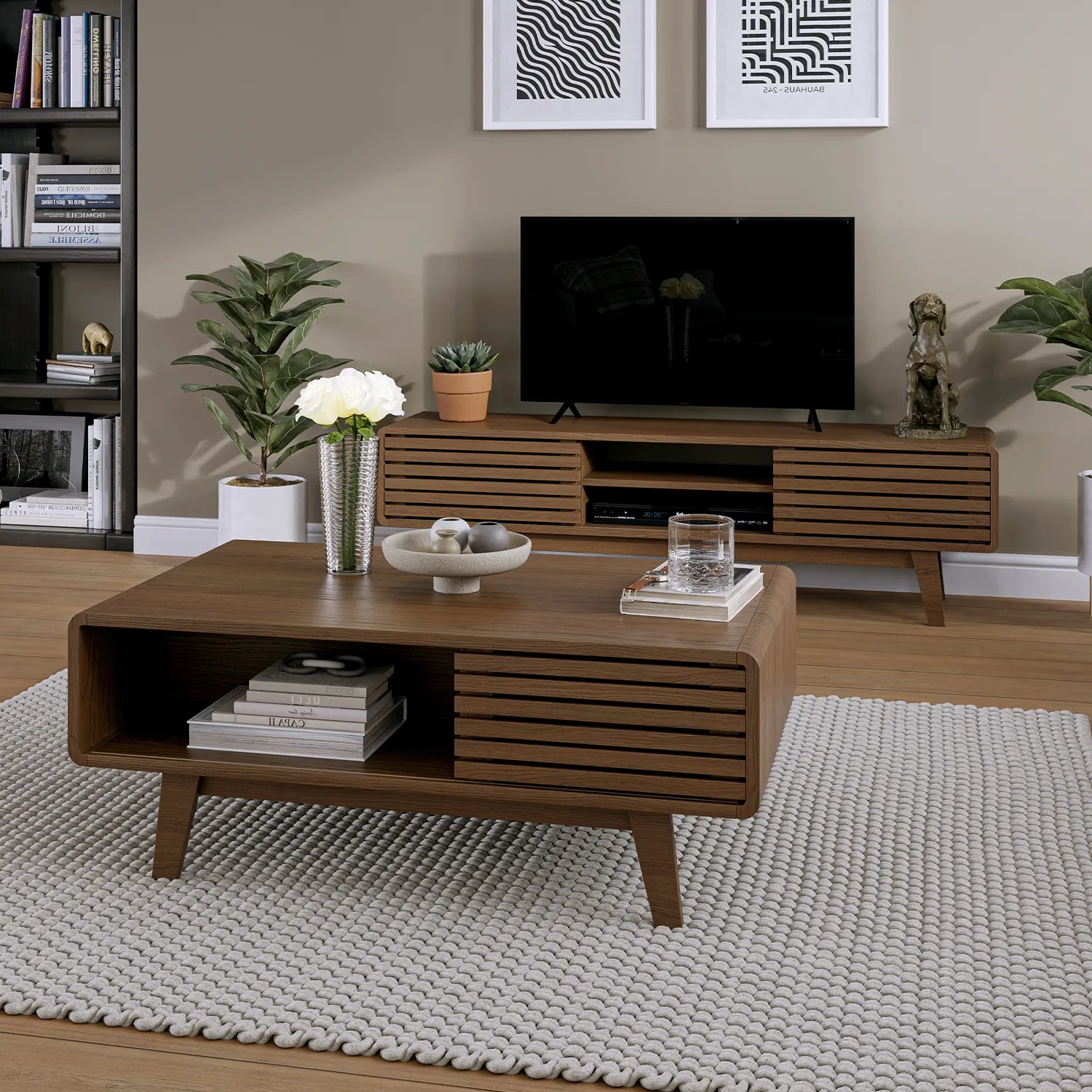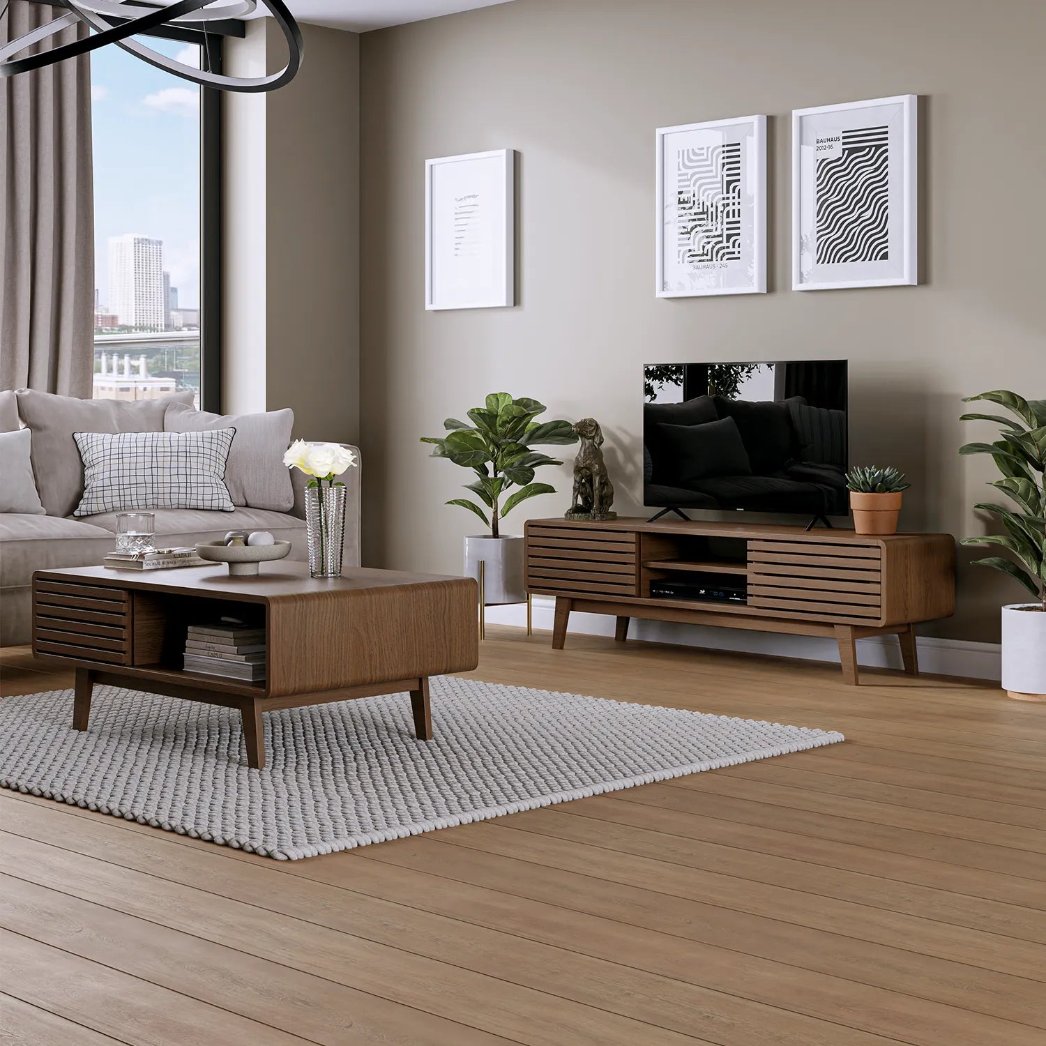 Bring a warm and refined atmosphere to your living room with the KOVA set. With its golden walnut finish, this set combines modern lines and clever storage spaces to combine elegance and functionality. Ideal for a chic and organized interior.