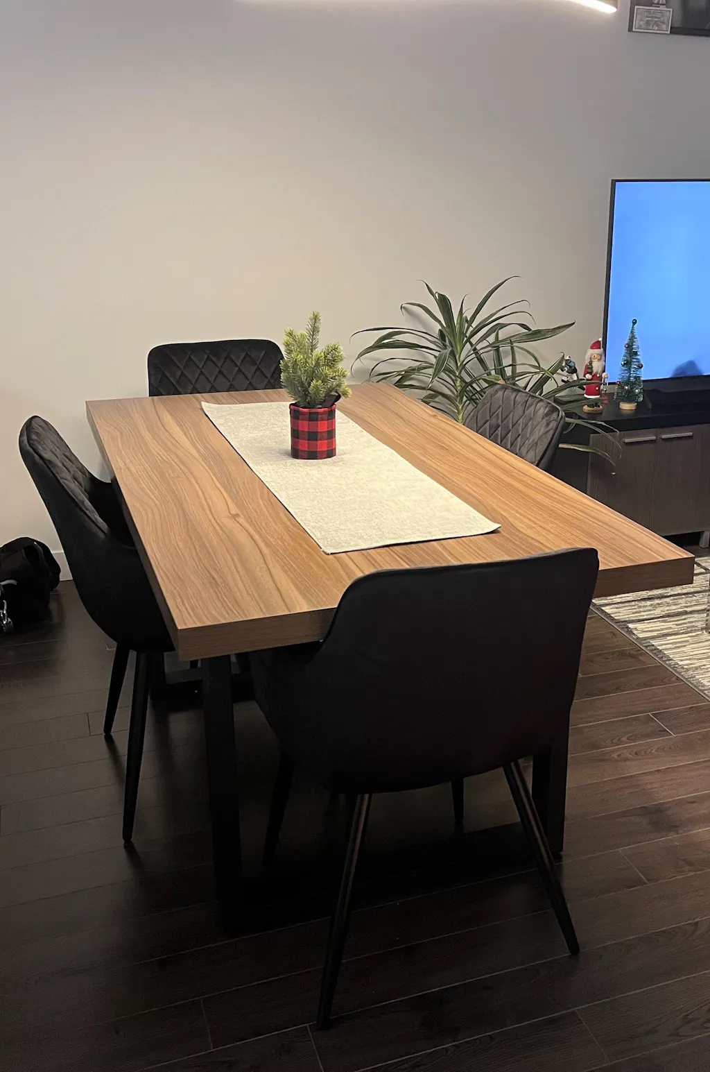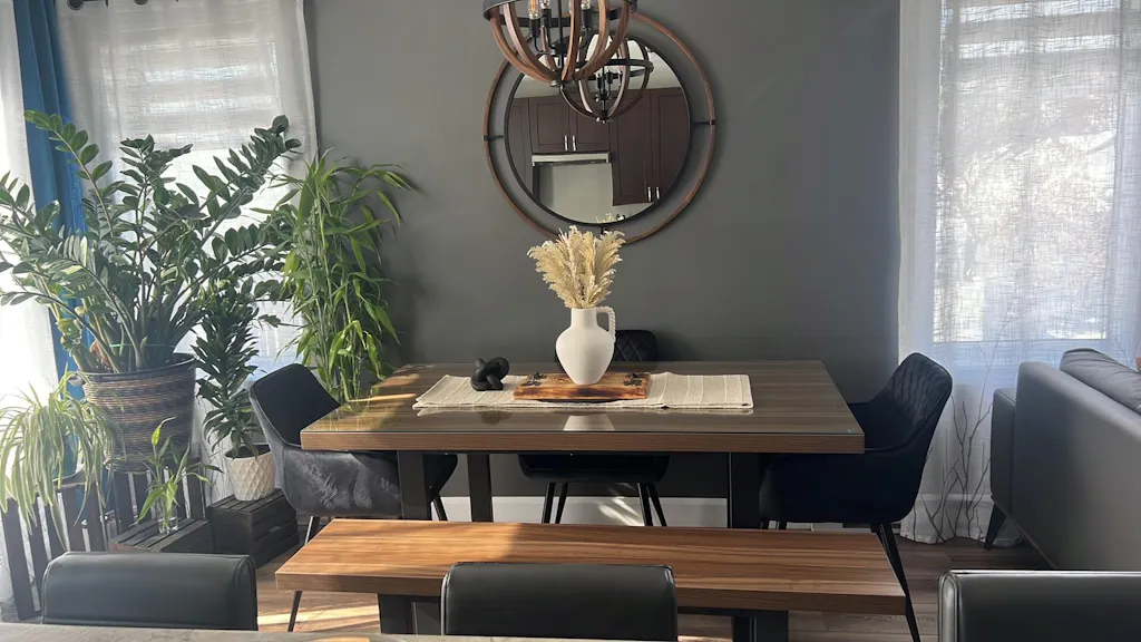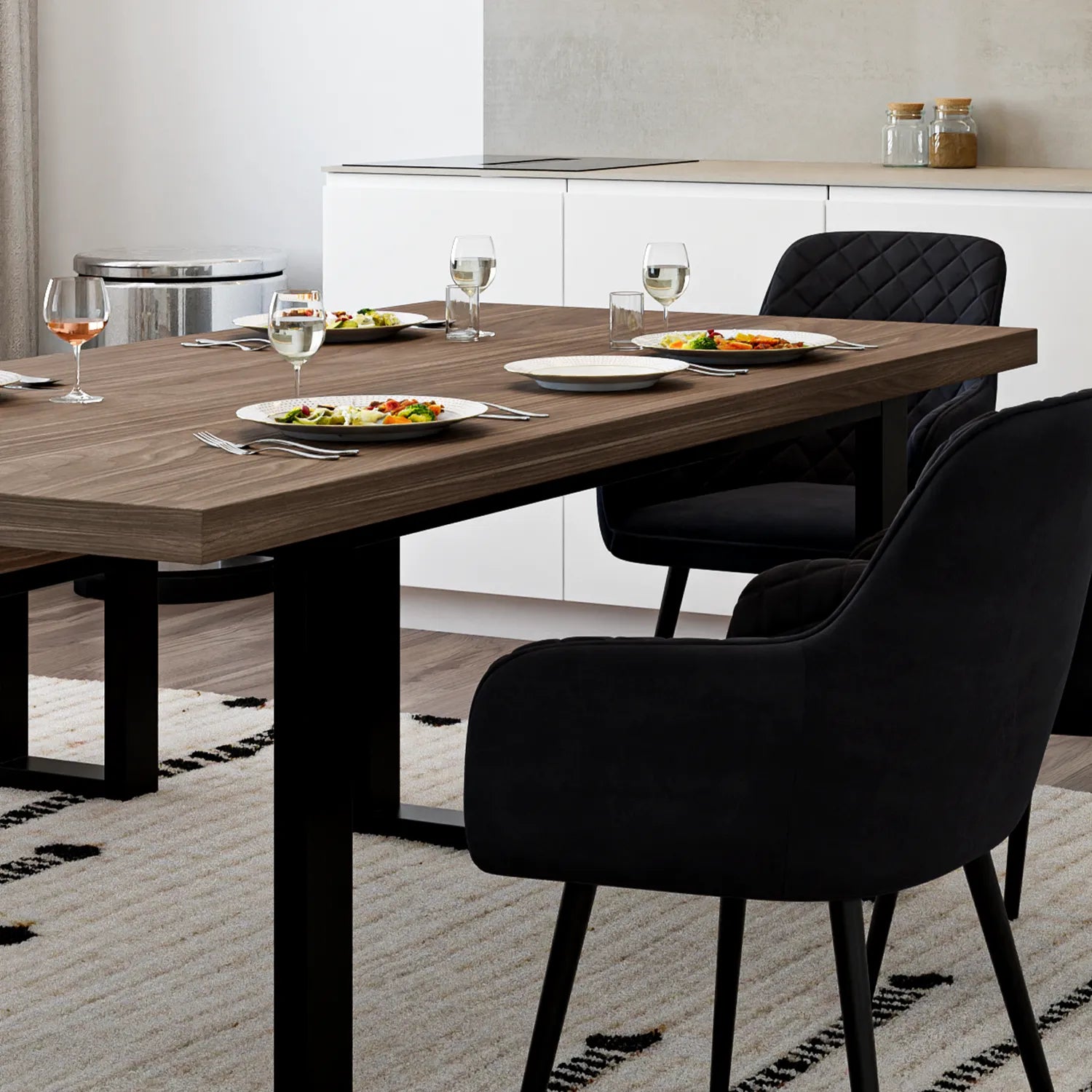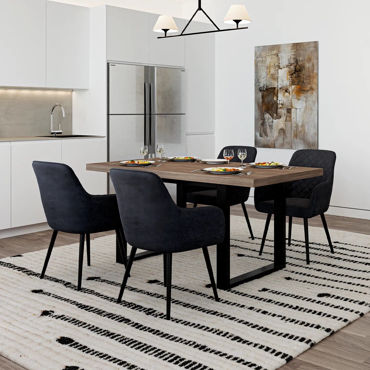Apportez une touche chaleureuse à votre salle à manger avec l’ensemble NŌRDIK compact. Mariant à la perfection son fini couleur noyer foncé et le noir, cet ensemble spacieux offre un style industriel raffiné qui s’intègre à tous les décors. Conçu pour les moments de partage, il est accompagné de chaises rembourrées au design chic et confortable. Idéal pour accueillir famille et amis.