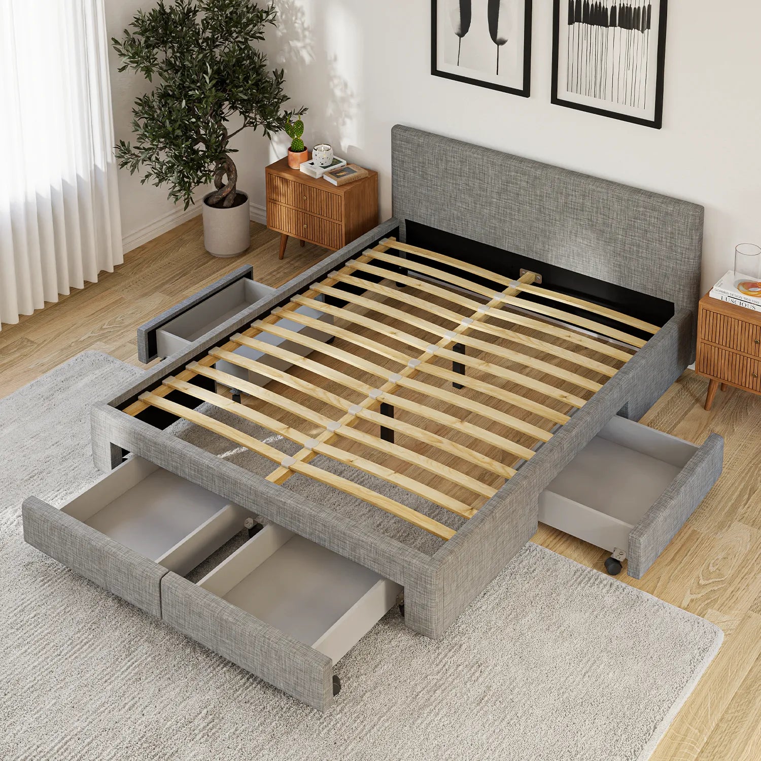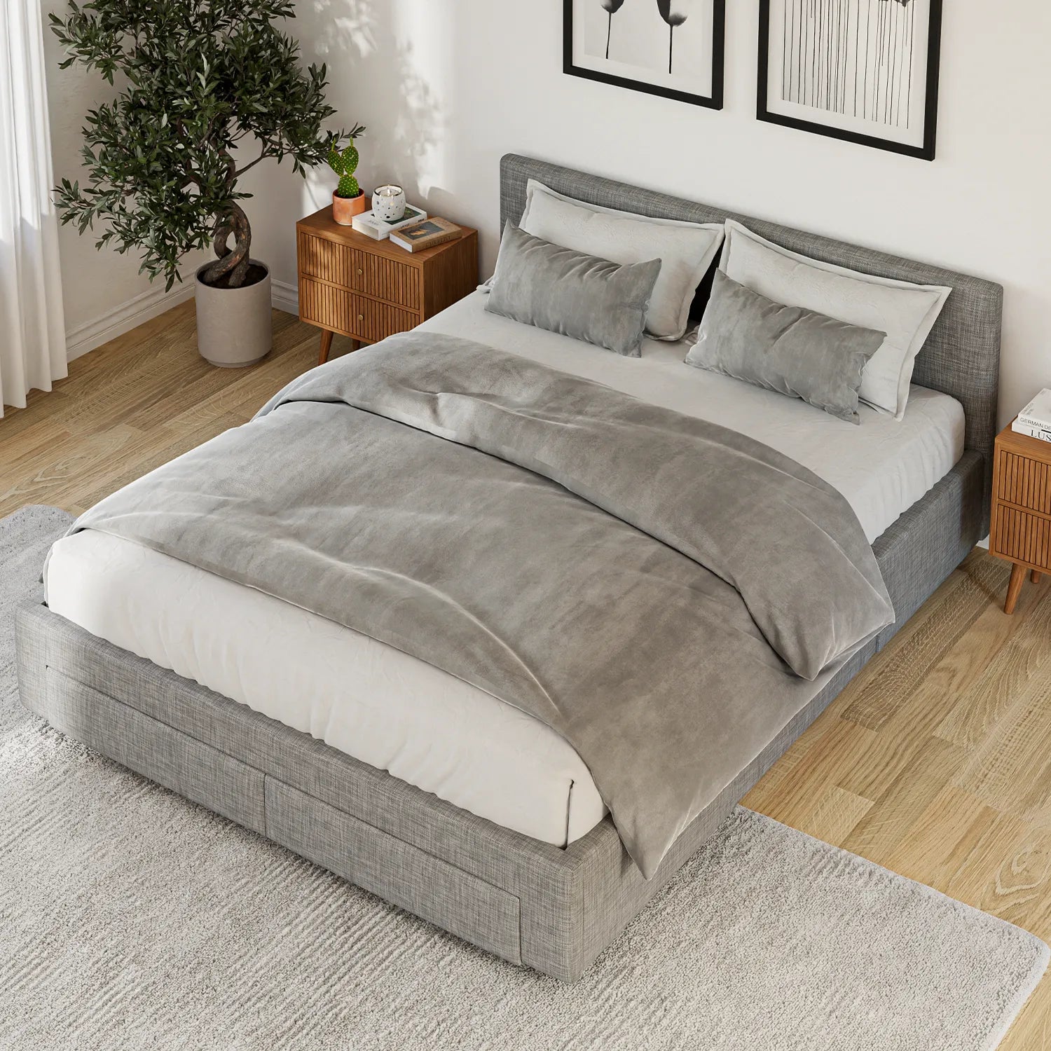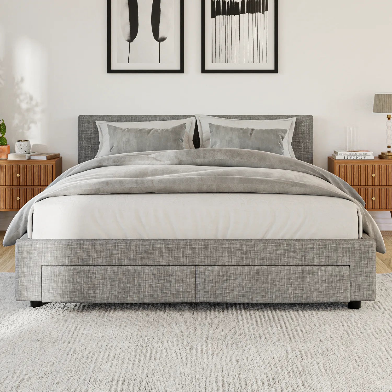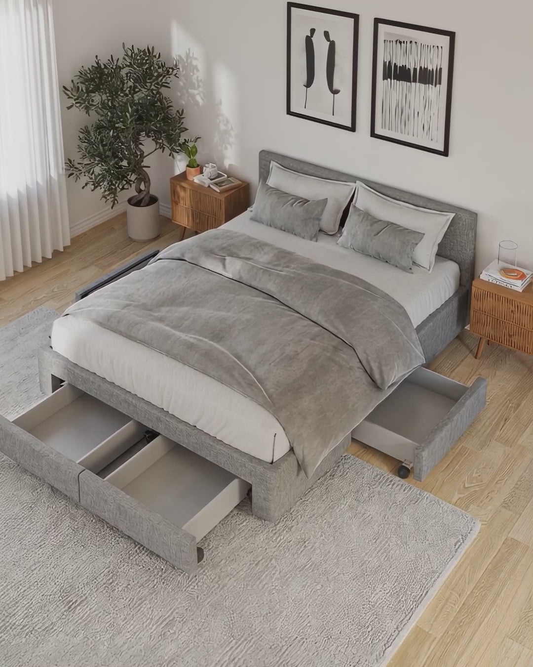 Bring a touch of modern elegance to your bedroom with the RĒVE bed frame, available in grey and black. Available in double and queen sizes, this bed frame combines style and functionality with its 4 spacious storage drawers located under the bed, perfect for optimizing your space.