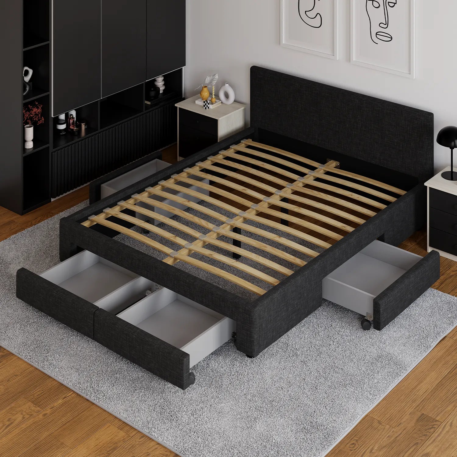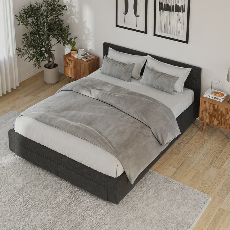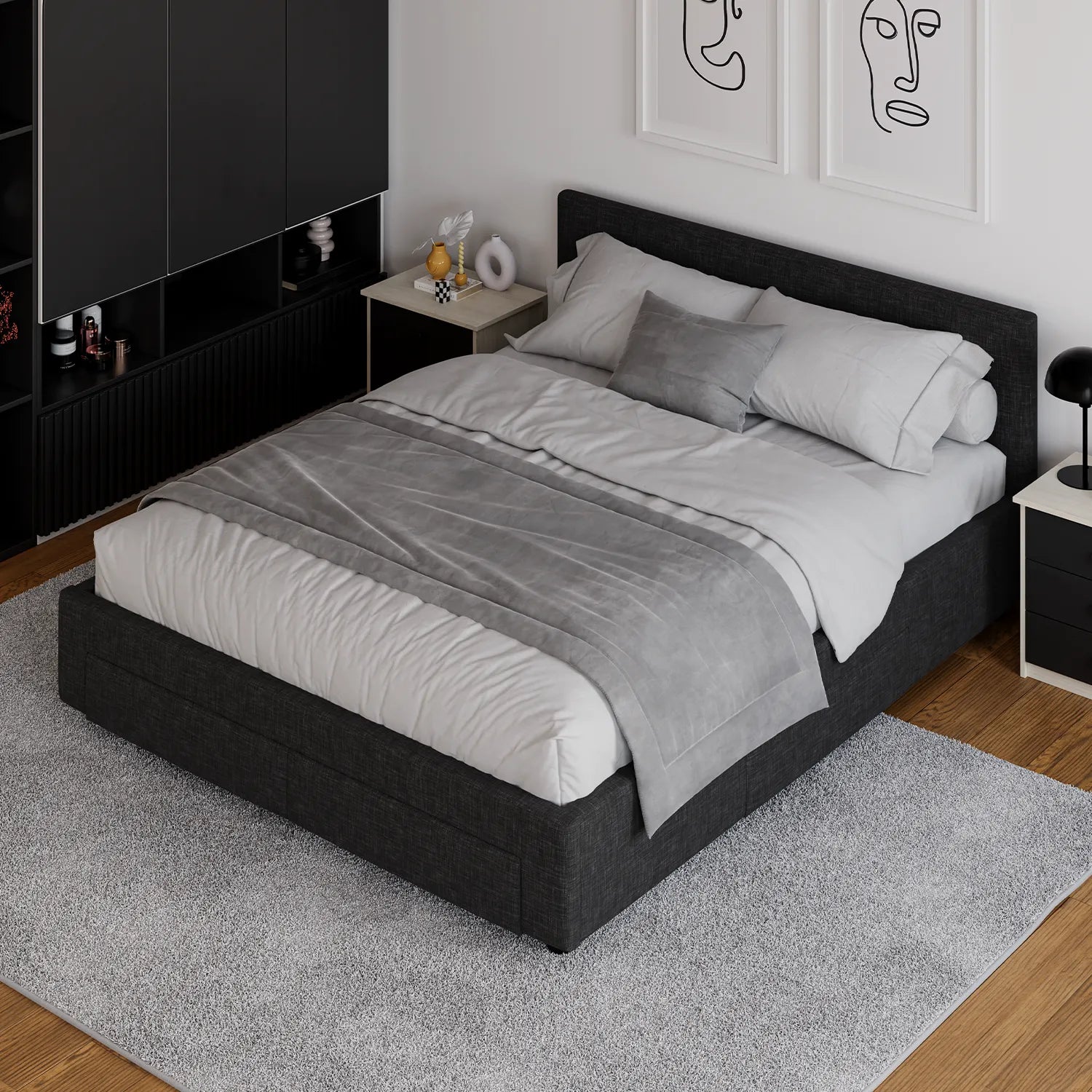 Bring a touch of modern elegance to your bedroom with the RĒVE bed frame, available in grey and black. Available in double and queen sizes, this bed frame combines style and functionality with its 4 spacious storage drawers located under the bed, perfect for optimizing your space.
