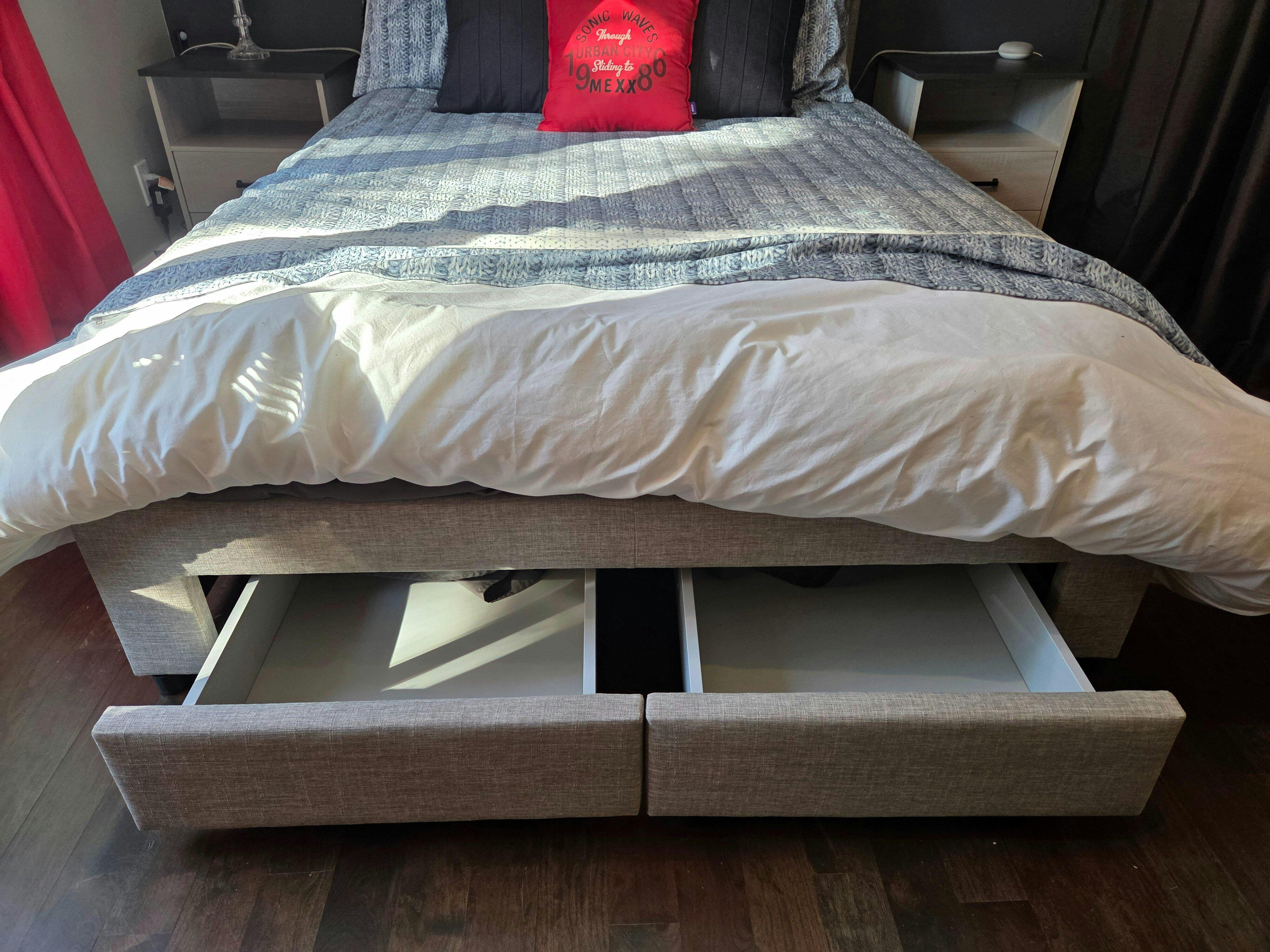 Bring a touch of modern elegance to your bedroom with the RĒVE bed frame, available in grey and black. Available in double and queen sizes, this bed frame combines style and functionality with its 4 spacious storage drawers located under the bed, perfect for optimizing your space.